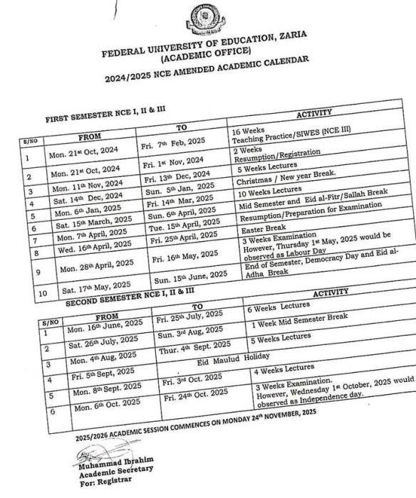 FUE, Zaria NEC 2nd Semester Amended Academic Calendar, 2024/2025