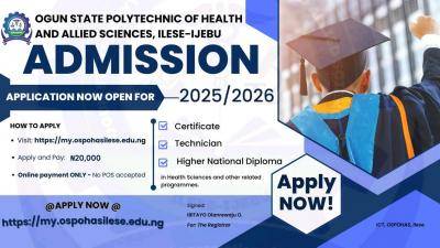 Ogun State Poly Of Health and Allied Science Certificate, Technician & HND Admission, 2025/2016