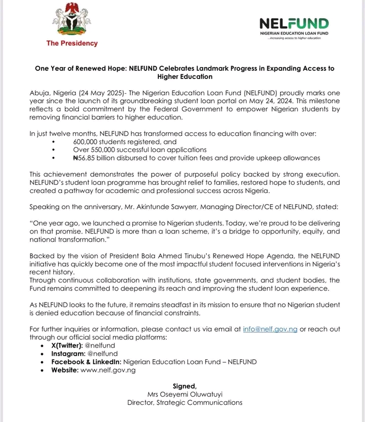 Continue readingIn a landmark achievement for education financing in Nigeria, the Nigerian Education Loan Fund (NELFUND) has successfully disbursed a whopping N56.85 billion in student loans to nearly 300,000 students across the country—signaling a transformative shift in how students access and afford higher education. This update, released in a recent status report, highlights the rapid growth and impact of the scheme launched on May 24, 2024 . Within just one year, the programme has touched 298,124 lives and benefited 198 institutions , including universities, polytechnics, and colleges of education. 🔍 A Breakdown of the Numbers Total Disbursed: ₦56.85 billion ₦30.17 billion paid directly to institutions as tuition ₦26.67 billion disbursed to students as upkeep Students Registered: 607,326 Loan Applications Submitted: 562,556 (92% success rate) These figures point to an overwhelming demand and trust in the programme, with daily increases showing momentum hasn’t slowed. For instance, just on May 28, 2025 , another 1,285 students registered , and 2,265 loan applications were submitted. The next phase of expansion is just around the corner. NELFUND is set to extend the loan scheme to vocational and skills training centres , with the pilot rollout expected to begin in Enugu State by mid-July 2025 . Why Enugu? The state boasts ready infrastructure and a proactive government—key ingredients for success in technical and vocational education sectors. Think fashion design, automotive skills, and digital trades . In a move to streamline access, NELFUND plans to integrate with institutional IT systems , allowing students to apply for loans directly through their schools —eliminating the need for standalone portal access and bringing support closer to underserved communities. This initiative is more than just funding—it’s a long-term investment in human capital , ensuring that no student is left behind due to financial constraints. Whether you're aiming for a degree or hands-on skills training, NELFUND is positioning itself as Nigeria’s educational equalizer Don't forget to Like, Share and Comment Download AbSApp on Google Play Store HERE Credit: AbS Posted By: Uwem #Blog
